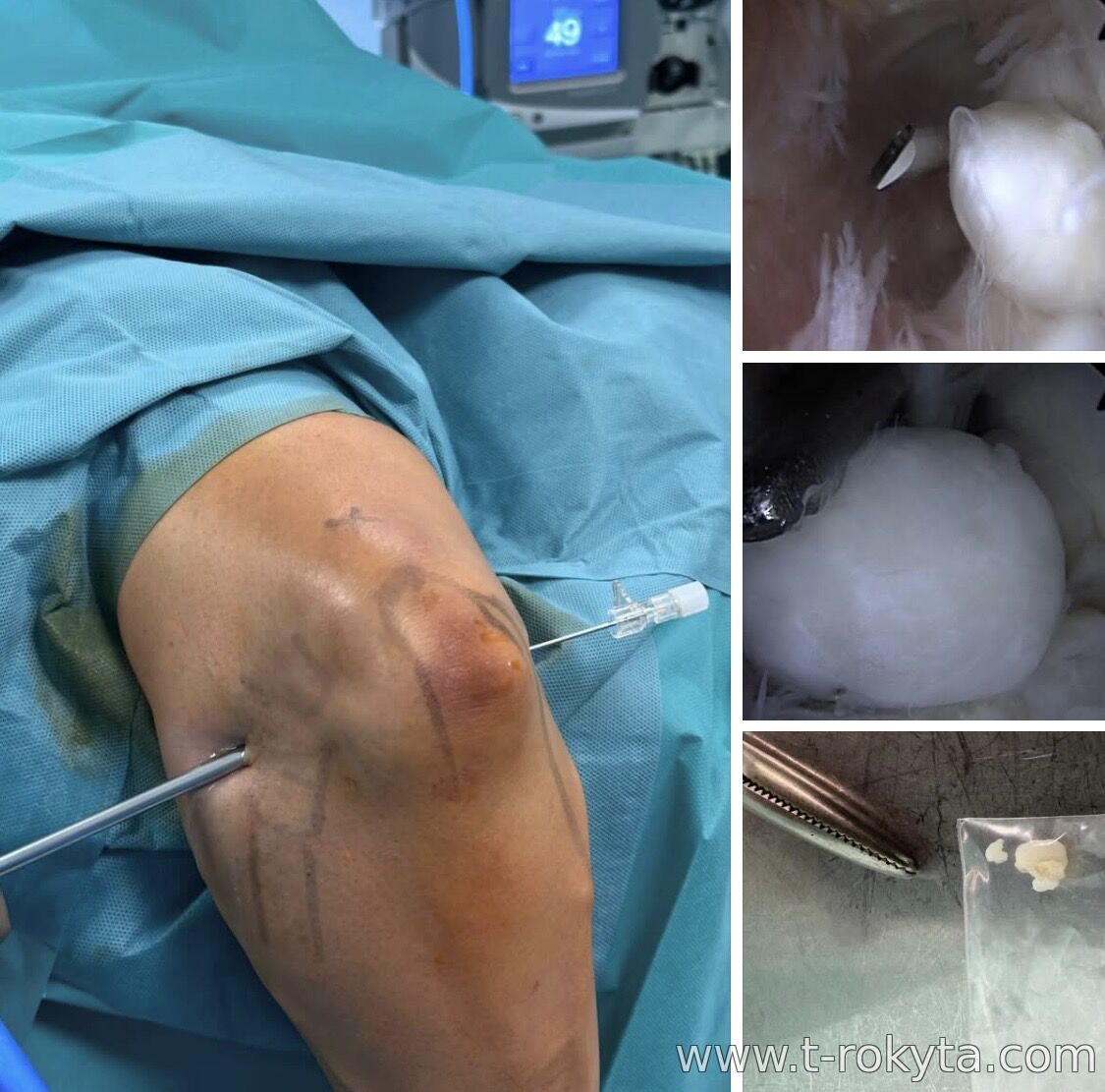 Так виглядає артроскопія ліктевого суглобу ззовні і зсередини. Основними показами до операції є наявність вільних кістково-хрящевих тіл, які руйнують і блокують суглоб. (.видалені тіла на фото) |